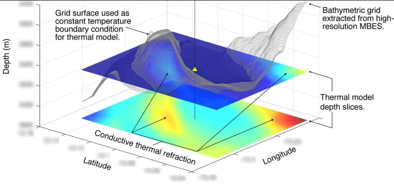 Measured sub-surface temperatures are used to calculate the shallow thermal gradient, and heat flowing vertically through the measurement interval is calculated using the thermal gradient and sediment thermal conductivity.