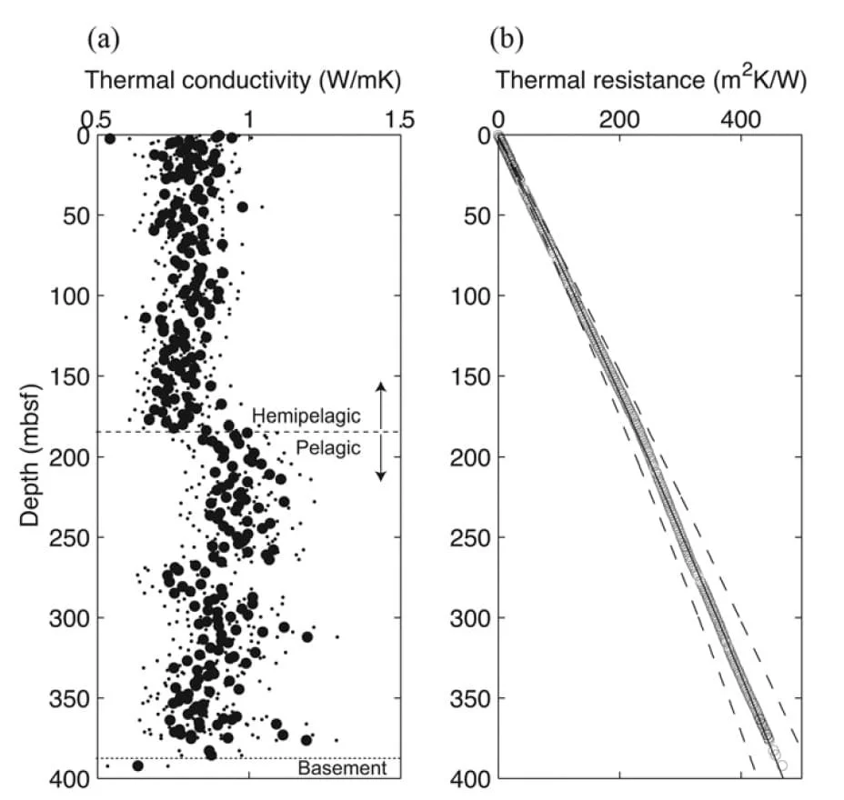 If seismic data are available and have been interpreted to correspond with known lithologies, then data from global compilations of sediment thermal conductivity for these lithologies can be used to generate a synthetic thermal resistance versus depth profile. The shallow thermal gradient measured by the heat flow probe can now be boot-strapped down the synthetic profile in order to provide a more accurate calculation of temperatures at depth.